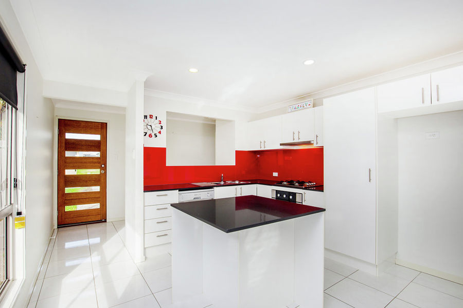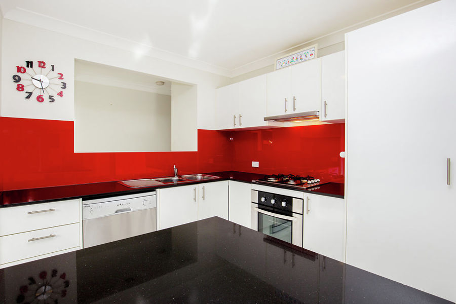 * Island bench modern kitchen with stylish glass splash back and Caesar Stone Benchtops